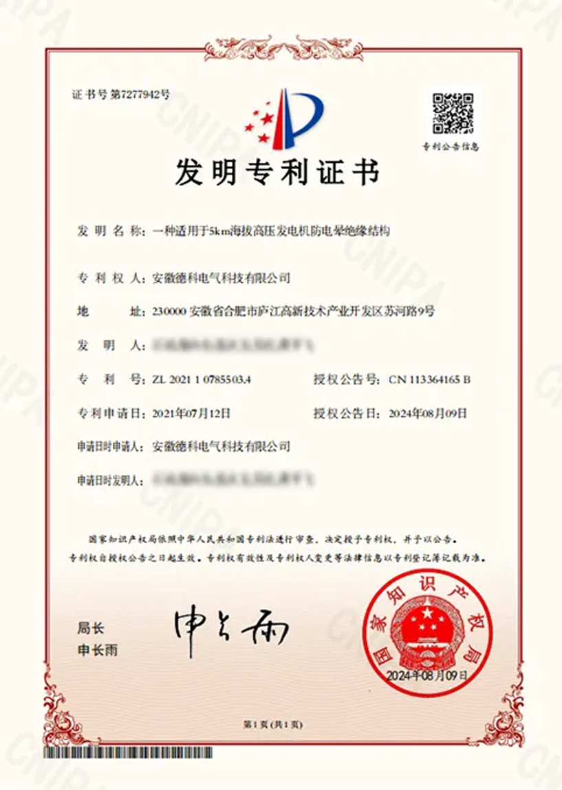 由安徽德科電氣科技有限公司申請的《一種適用于5km海拔高壓發(fā)電機(jī)防電暈絕緣結(jié)構(gòu)》發(fā)明專利和《一種發(fā)電機(jī)減震底座》等五項實用新型專利,獲得了國家知識產(chǎn)權(quán)局的批復(fù),正式獲得專利授權(quán)。德科電氣一直堅持自主研發(fā)和技術(shù)創(chuàng)新,所有產(chǎn)品皆擁有自主知識產(chǎn)權(quán),截至目前共獲得國家授權(quán)專利64項(其中:發(fā)明專利19項)。