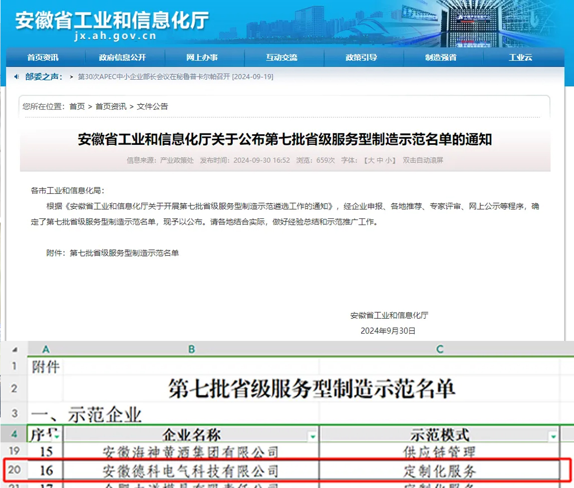 根據(jù)《安徽工業(yè)和信息化廳關(guān)于開展第七批省級服務(wù)型制造示范遴選工作的通知》,經(jīng)多方專業(yè)評審后,德科電氣入選“安徽省服務(wù)型制造示范企業(yè)”名單。